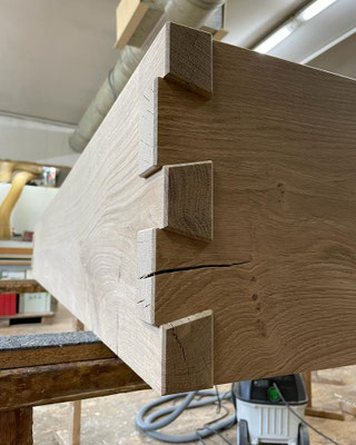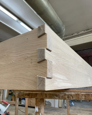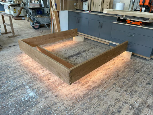 Hier durften wir unserem Kunden den Unterbau eines Eiche-Vollmassiv-Bettes anfertigen. Im Rahmen dieses Projektes haben wir die Kunst des Zinkens angewendet. Dabei wird das Holz mehrfach ineinander verzahnt und verleimt, was nicht nur für mehr Stabilität sorgt, sondern auch schön anzusehen ist. Durch die indirekte Beleuchtung kann man die gemütliche Atmosphäre bereits spüren, die es bald in einem Schlafzimmer entfalten wird.