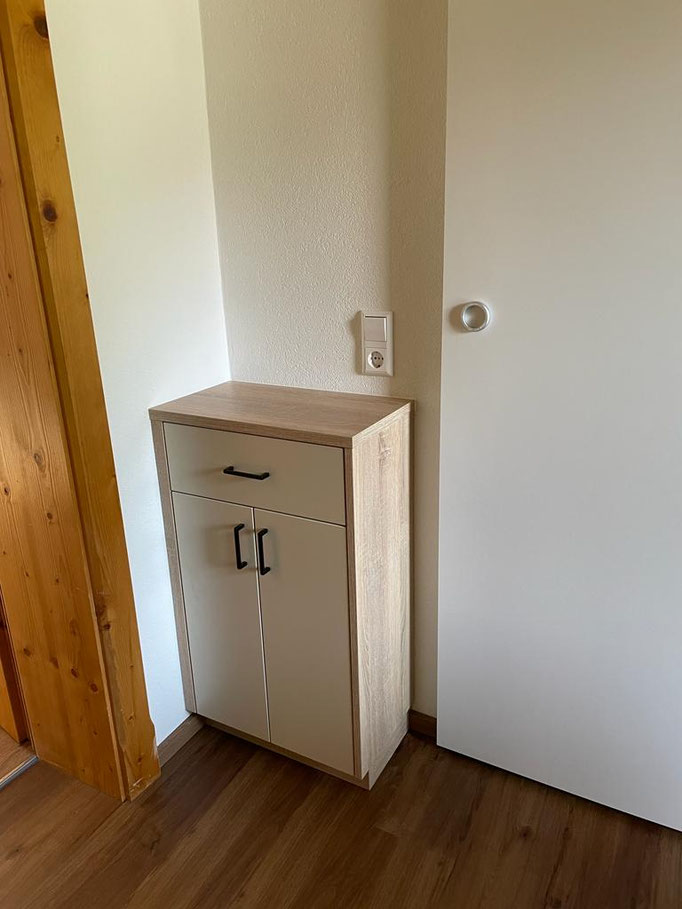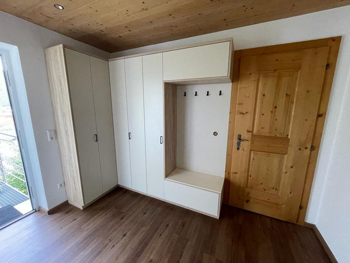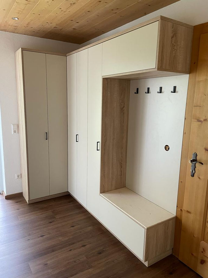 Praktisch und einladend: Diese Garderobenausstattung kombiniert einen großzügigen Garderobenschrank mit einem platzsparenden Eckregal. Das helle Holz in Verbindung mit einem dunkleren Rahmen schafft einen eleganten Kontrast und sorgt für eine harmonische Optik. Perfekt für Eingangsbereiche, die sowohl Funktionalität als auch Stil vereinen sollen.
