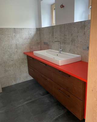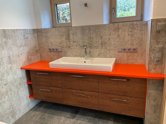 Ein großzügiges Waschbecken wurde sorgfältig in das Design integriert, um Funktionalität und Stil zu vereinen. Orange Abdeckplatten und Seitenflächen setzen Akzente und verleihen dem Badezimmer einen lebendigen Touch, ohne dabei auf Eleganz zu verzichten.